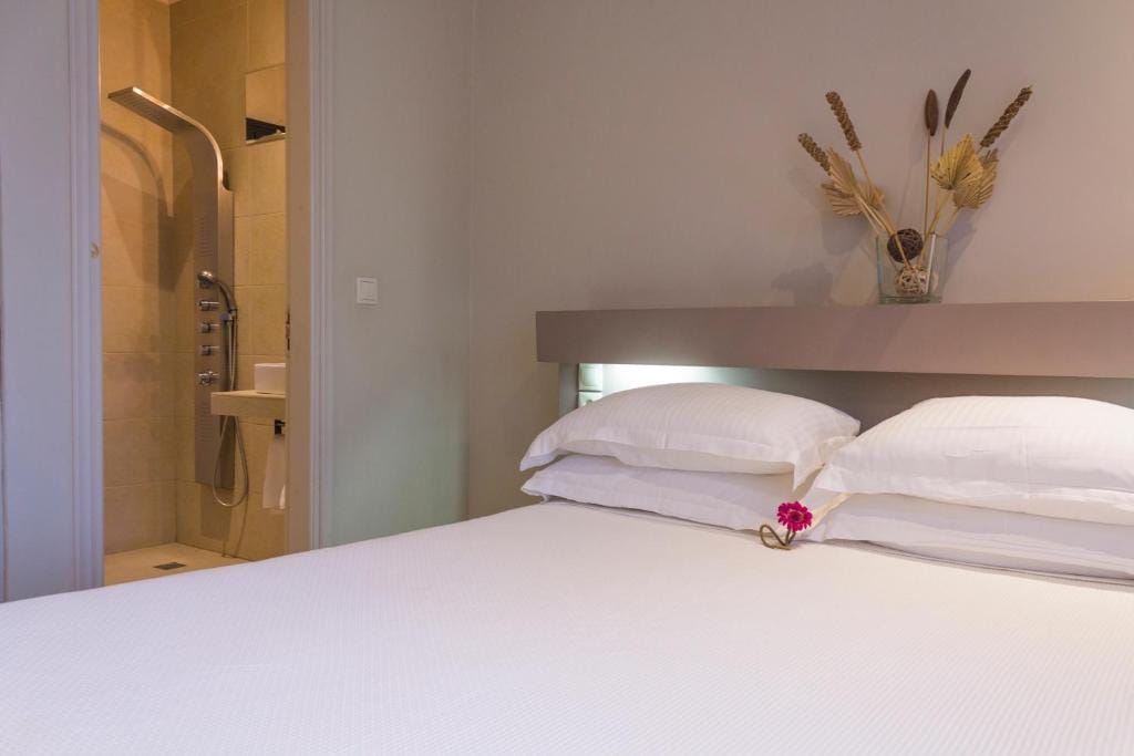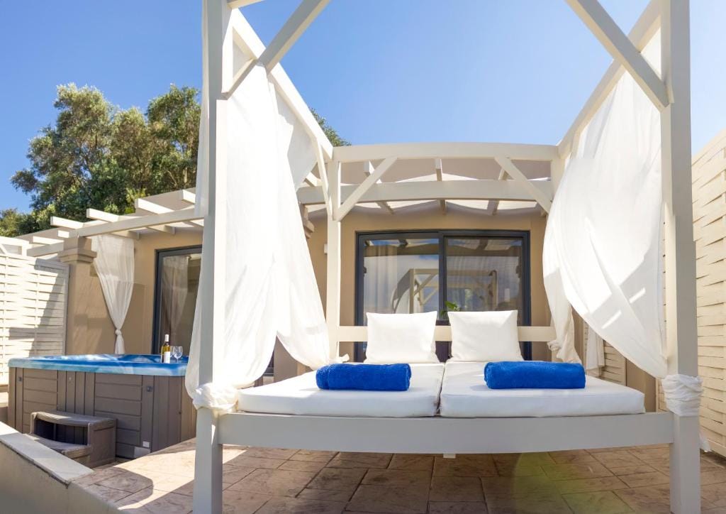 The Suite Courtyard View with Private Hot-Tub offers a luxurious affordable stylish private setting of a 1 Double Bed Bedroom with an open space Kitchenette and en-suite bathroom in 20 squared meters, and private enclosed outdoors patio of approx. 20 more squared meters with sunbeds and a relaxing dinining setting.